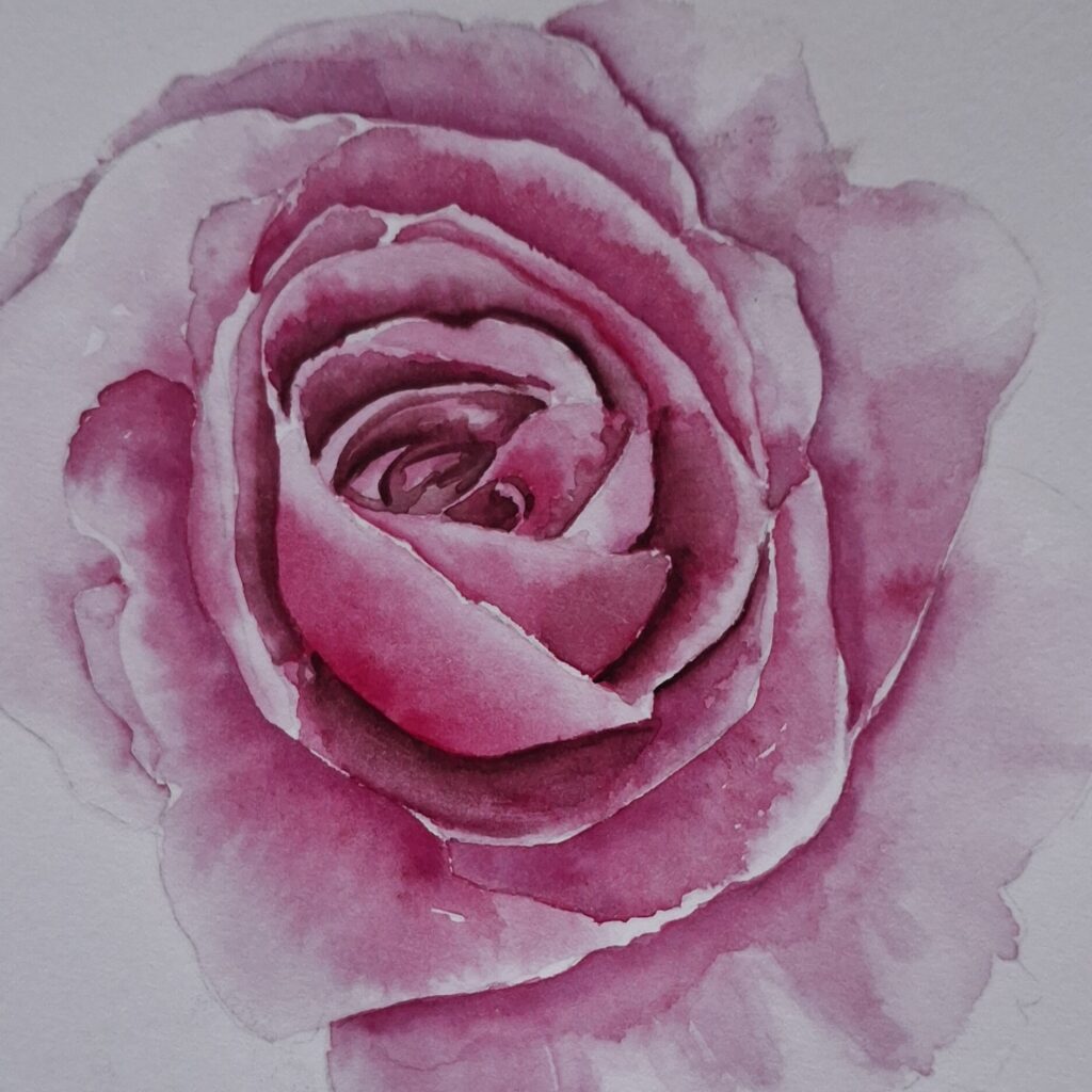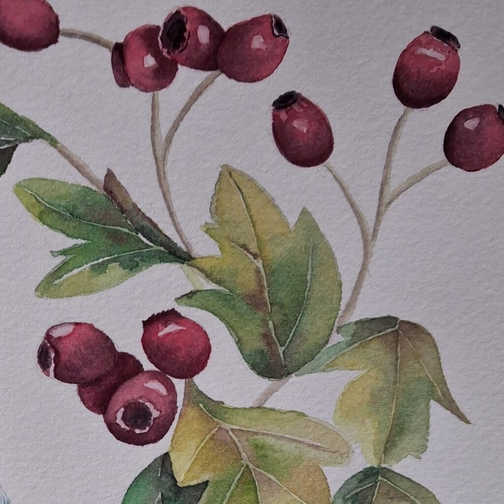 From there, the course gradually deepens. We move on to more complex structures of petals and leaves. You’ll develop a stronger understanding of proportion, spacing, and composition, alongside practical skills in layering washes, preserving light, and mixing fresh, natural colour.